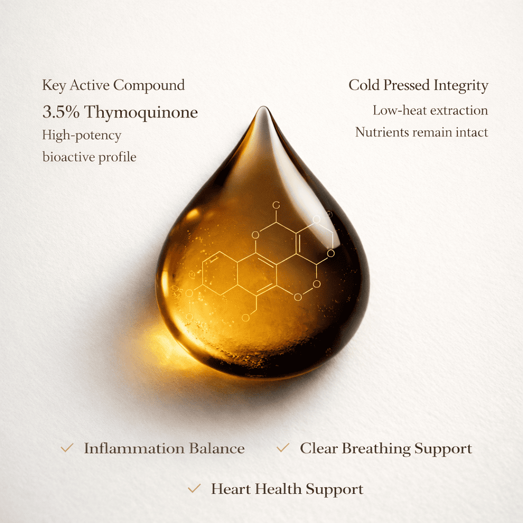 Cold pressed and rich in thymoquinone, it helps calm inflammation, supports clearer breathing and maintains healthy circulation. A simple daily dose for full body wellness support.