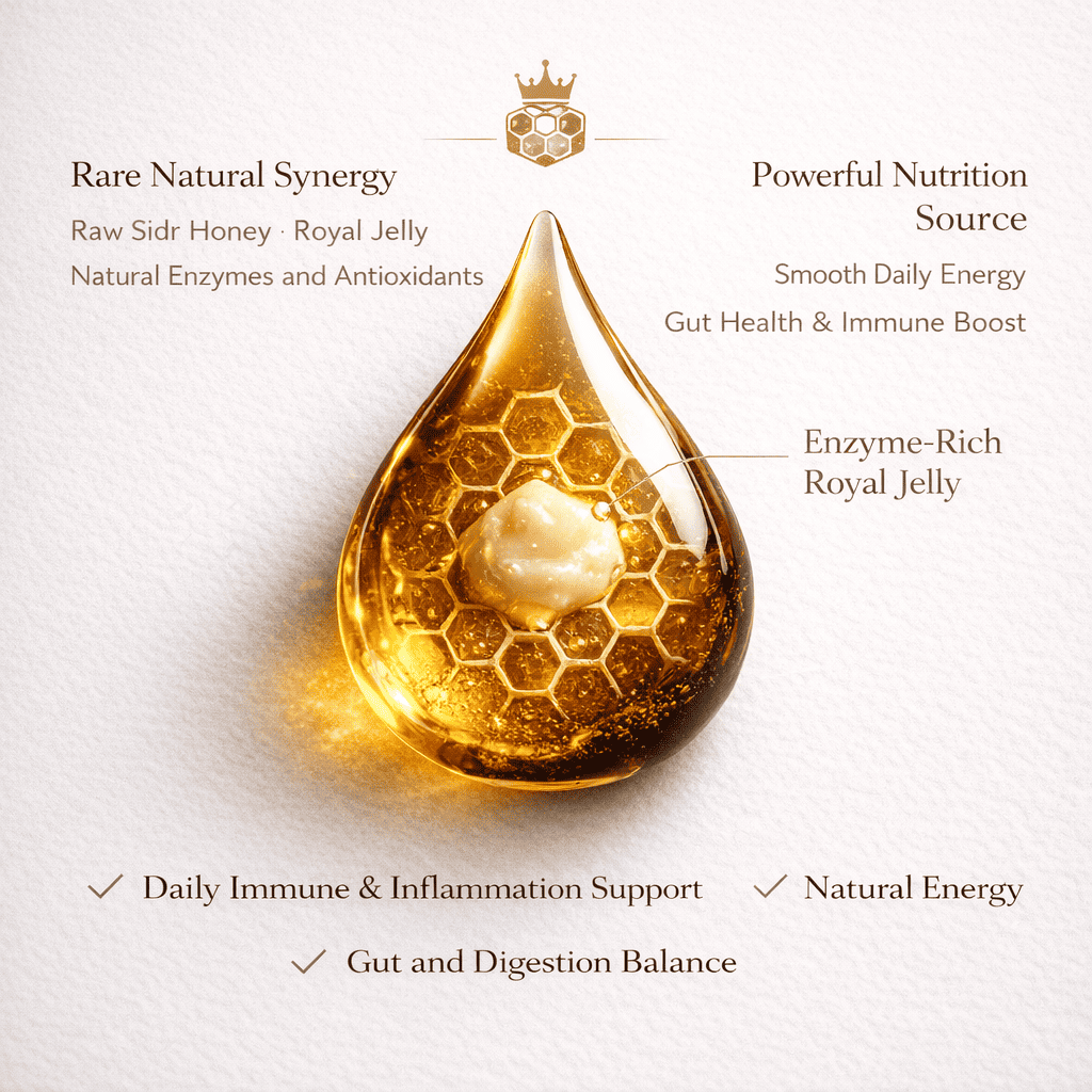 Raw Yemeni Sidr honey enriched with royal jelly sourced from the queen’s hive, traditionally known as the most nutrient-dense food in the colony. Together, they support daily immunity, smooth steady energy, and healthy digestion through naturally occurring enzymes and bioactive compounds.